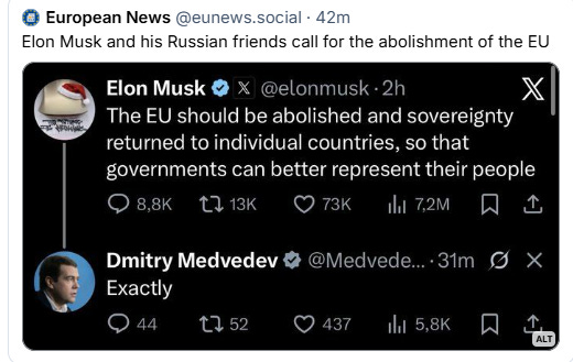 That is why the spectacle of Elon Musk calling for the abolition of the EU, and Dmitry Medvedev replying “Exactly”, matters so much. It compresses the logic into a single exchange. The rhetoric is sovereignty. The payoff is fragmentation. And the beneficiaries are those who would prefer a Europe of pliable states to a Europe that can bargain, sanction and govern as one.¹